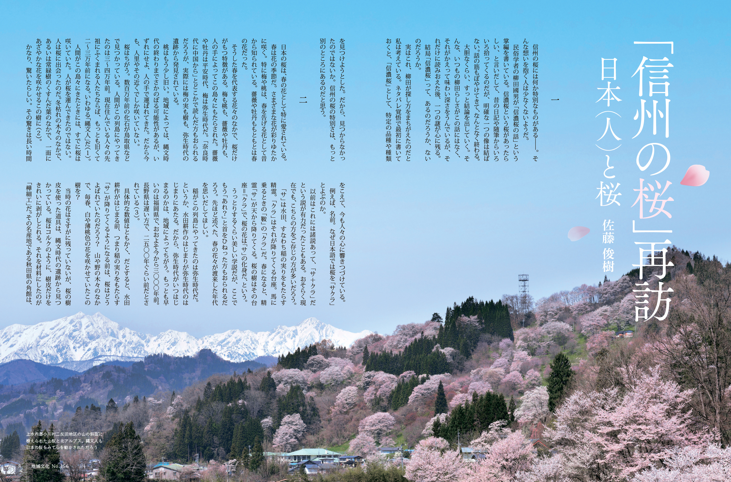 桜は、春の信州に美しい景観をもたらし、人々の生活に彩りを添えています。桜はまた、長い歳月を重ねた木々が宿す記憶や、土地に根づく人々の営みを静かに伝えています。古くから日本人の感性に寄り添い、春を告げる喜びとともに、はかなく散りゆく無常を感じさせてきた桜は、他の花には代えがたい特別な存在でもあります。本号では、こうした桜と人とのかかわりについて、さまざまな角度から見つめ直します。